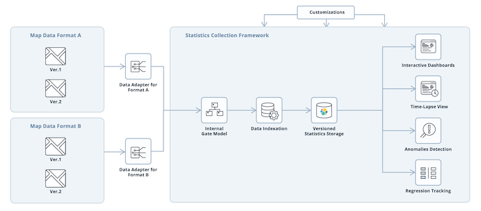 The Map Statistic Framework is designed to collect and process data in various formats. Its modular, service-oriented architecture supports NDS Classic, NDS.Live, OSM, and Overture Maps formats, providing data adapters that convert diverse datasets into a unified model suitable for statistical calculations. The framework enables developers and researchers to analyze map data consistently across formats, ensuring high-quality, interoperable map products.