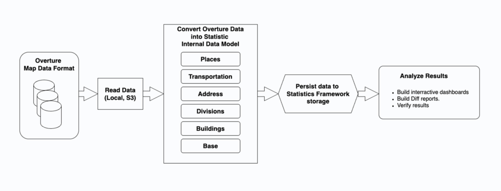 Overture Map Statistics Generation: Looking ahead, the framework will support the generation of standardized Overture Map Statistics, enabling the community to monitor data quality, interoperability, and completeness across open map datasets. This initiative will provide a foundation for future tools and visualizations, empowering all stakeholders working with geospatial data to gain deeper insights and drive innovation in mapping and location-based services.